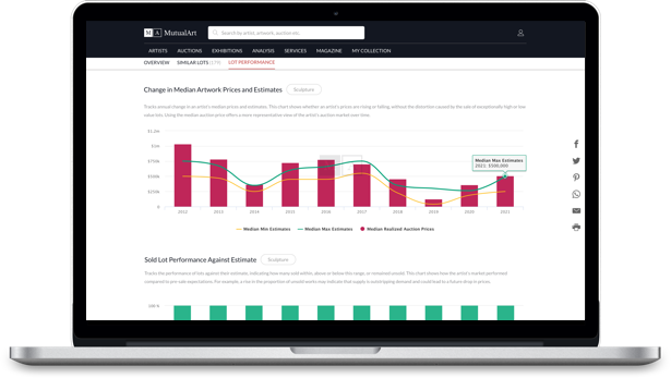 MutualArt provides decision support tools for anyone assessing the value of art. Our Price Database makes it easy to search past and upcoming auction prices for over 904,000 artists, and provides artist performance charts, as well as detailed market analysis, tracking the performance of artworks by category, medium, artist nationality, and sale location.