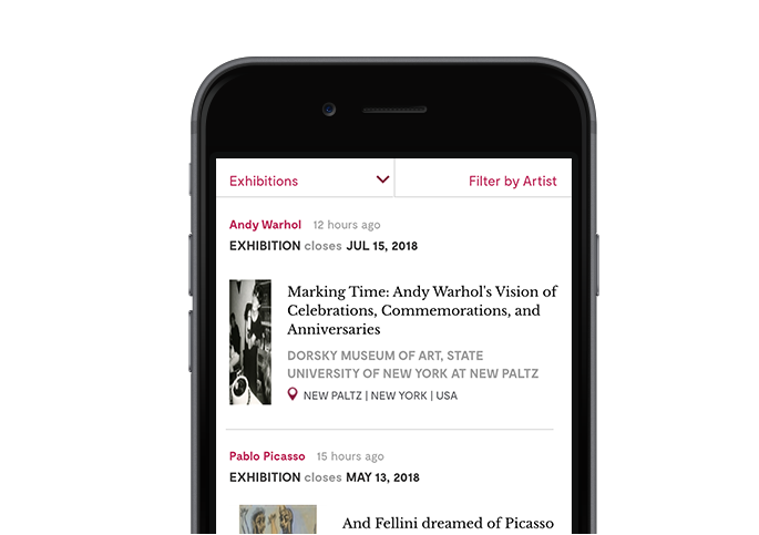 We track shows at over 17,000 museums, galleries and auction houses worldwide, and tell you when your favorite artists feature