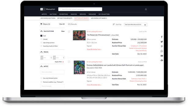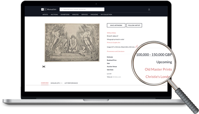 MutualArt provides decision support tools for anyone assessing the value of art. Our Price Database makes it easy to search past and upcoming auction prices for over 904,000 artists, and provides artist performance charts, as well as detailed market analysis, tracking the performance of artworks by category, medium, artist nationality, and sale location.